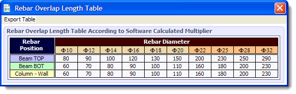 علاوه بر آن توسط منوی Report در پنجره اصلی نرم افزار و گزینه Rebar Overlap Table و یا فشردن Ctrl+L میتوانید همواره به جدول طولهای وصله بصورت زیر دسترسی داشته باشید.