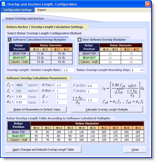 در این حالت نرم افزار بر اساس تنظیمات انجام شده در قسمت Software Overlap Calculation Parameters ضرایب محاسبه طول مهاری و طول وصله را براساس روابط مشخص شده، بدست می آورد و از آنها برای طراحیهای خود استفاده مینماید.