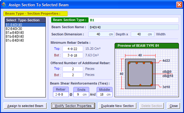 Number of Additional Reabr: در این قسمت شما میتوانید تعداد میلگردی را که ترجیح میدهید نرم افزار بعنوان تعداد میلگردهای تقویتی در محاسبات خود استفاده نماید انتخاب مینمایید. نرم افزار از بین حالتهای ممکن حالتی که تعداد میلگردهایی برابر با آنچه که شما ترجیح داده اید را دارا میباشد انتخاب مینماید. البته اگر میزان تعداد میلگرد لازم کمتر از تعدادی باشد که شما ترجیح داده اید، نرم افزار بصورت خودکار تعداد میلگرد کمتر را انتخاب خواهد نمود. و در صورتی که نرم افزار از بین حالتهای ممکن حالتی که تعداد میلگردهایی برابر با آنچه که شما ترجیح داده اید را پیدا نکند، بصورت خودکار حالتی که کمترین تعداد میلگرد را دارا میباشد انتخاب مینماید.