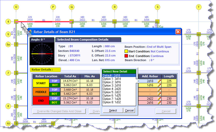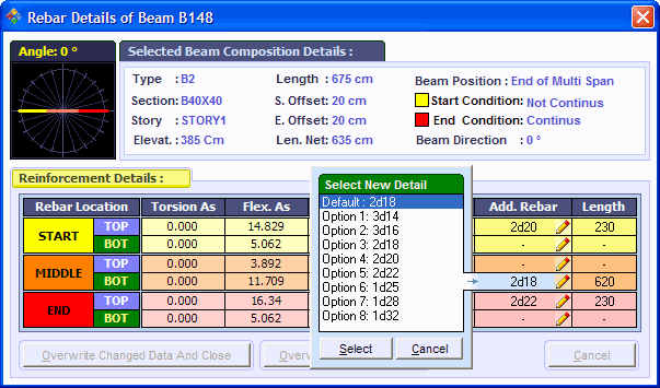 در پنجره باز شده حالتهای میلگرد گذاری ممکن دیگر درج گردیده است. با انتخاب هر حالت میلگردگذاری دیگر و فشردن دکمه Overwrite حالت انتخاب شده جایگزین میگردد. در صورتیکه جزئیات میلگرد گذاری موردنظر شما در لیست نباشد میتوانید جزئیات مورد نظر خود را در محل مربوطه بصورت دستی ویرایش نمایید.