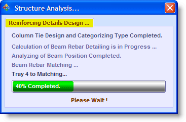 پس از صادر نمودن فرمان انجام طراحی جزئیات آرماتوربندی با هریک از روشهای بالا، پنجره زیر نمایان خواهد گردید که در آن میزان پیشرفت طراحی نمایان خواهد بود.