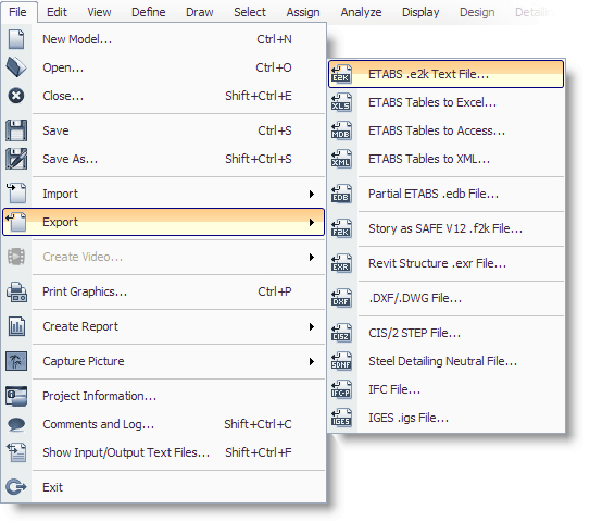 ابتدا پس از مدلسازی پروژه، آنالیز و نهایتا طراحی سازه در نرمافزارETABS ، میبایست فایل هندسه سازه ایجاد گردد. برای این منظور همانند شکل زیر از منوی File گزینه Export و سپس ETABS e2k Text File استفاده نمایید تا فایل متنی هندسه سازه ایجاد گردد. توجه نمایید که واحدهای فایل هندسه سازه میبایست Kgf وCm باشند.