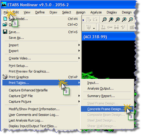 - حال برای انتقال نتایج طراحی سازه همانند تصویر زیر از منوی File گزینه Print Tables را انتخاب نمایید و بر روی گزینه Concrete Frame Design کلیک نمایید.