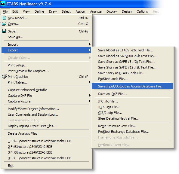 برای این منظور همانند تصویر زیر میبایست ازمنوی File گزینه Export و سپس گزینه Save Input/Output as Access Database File برای ذخیره کردن فایل نتایج طراحی به فرمت پایگاه داده های اکسس با پسوند MDB استفاده نمایید. دقت نمایید که سیستم واحدهای نرم افزار ایتبز میبایست بر روی kgf-cm باشد.