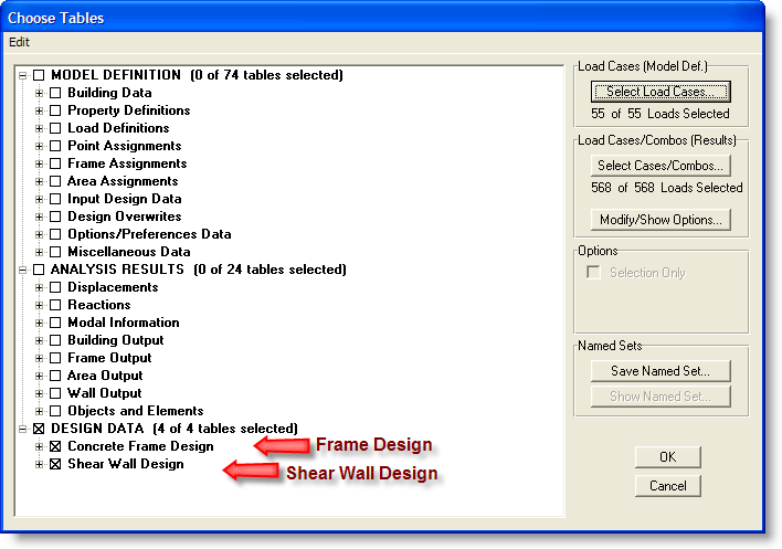 در این پنجره همانند تصویر بالا گزینه Concrete Frame Design را برای ذخیره نتایج طراحی تیرها و ستونهای پروژه انتخاب نمایید. در صورتیکه بخواهید نتایج طراحی دیوارهای برشی را ذخیره نمایید، گزینه Shear Wall Design را در این پنجره انتخاب نمایید. دقت نمایید که این گزینه ها فقط درصورتیکه سازه طراحی شده باشد یا دیوارهای برشی طراحی شده باشند قابل رویت خواهند بود.