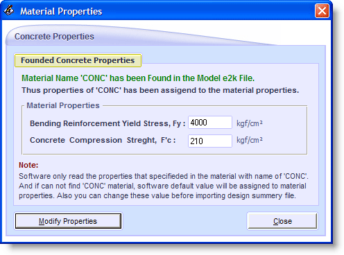 درصورتیکه نرم افزار متریال 'CONC' را یافته باشد، همانگونه که در پنجره بالا مشاهده میگردد با نوشته سبز رنگ Material Name 'CONC' has been found in Model e2k File در بالای پنجره گزارش میدهد که متریال CONC را یافته است و خصوصیات مربوط به آنرا برای مشخصات بتن درنظر گرفته است. اما درصورتیکه نتواند متریال 'CONC' را بیابد بوسیله پیغام قرمز رنگ Material Name 'CONC' Not found in Model e2k File در بالای پنجره گزارش میدهد که نتوانسته است این متریال را بیابد و در نتیجه مقادیر پیش فرض نرم افزار برای مشخصات بتن درنظر گرفته شده است.البته شما تا قبل از وارد نمودن فایل نتایج طراحی سازه میتوانید این مقادیر را مطابق نظر خود تغییر دهید. برای این منظور پس از وارد نمودن فایل هندسه سازه و قبل از وارد نمودن فایل نتایج طراحی با استفاده از منوی Define گزینه Material Properties پنجره مشخصات متریال را که بالا مشاهده میگردد را باز نمایید سپس در قسمت Material Properties مقادیر تنش تسلیم فولاد و مقاومت فشاری بتن را برحسب کیلوگرم بر سانتیمتر مربع وارد نمایید و سپس دکمه Modify Properties را کلیک نمایید تا تغییرات ایجاد شده ذخیره گردند. در این حالت نیز نرم افزار گزارش میدهد که اطلاعات متریال توسط کاربر ویرایش گردیده است و از اطلاعات وارد شده توسط کاربر بعنوان مشخصات بتن استفاده خواهد شد.