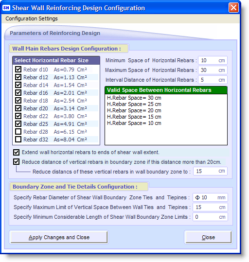 ابتدا در قسمت Select Horizontal Rebar Size میلگردهایی که میخواهید در فرایند طراحی مشارکت داشته باشند را انتخاب نمایید. سپس مقادیر حداقل و حداکثر مجاز فاصله بین میلگردهای افقی و نیز فاصله بین گامها را تعیین نمایید. همانگونه که در شکل بالا ملاحظه مینمایید، با تعیین این پارامترها لیست فواصل مجاز بین میلگردهای افقی دیوار که نرم افزار در فرایند طراحی جزئیات میلگرد گذاری دیوار میتواند از آنها استفاده کند، تعیین میگردد.